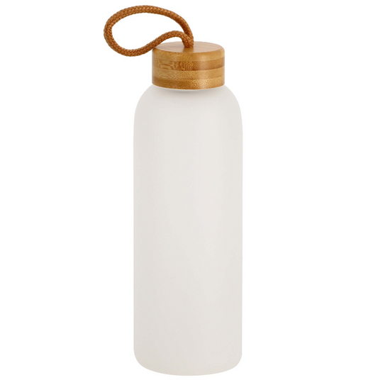 Bouteille 750ml en verre givré blanc mat, bouchon bambou + boucle en corde -